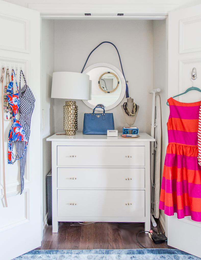 The dresser is from the Ikea Hemnes collection and I’ve had it for years. I replaced the hardware with these lucite and brass knobs from Ballard Designs.